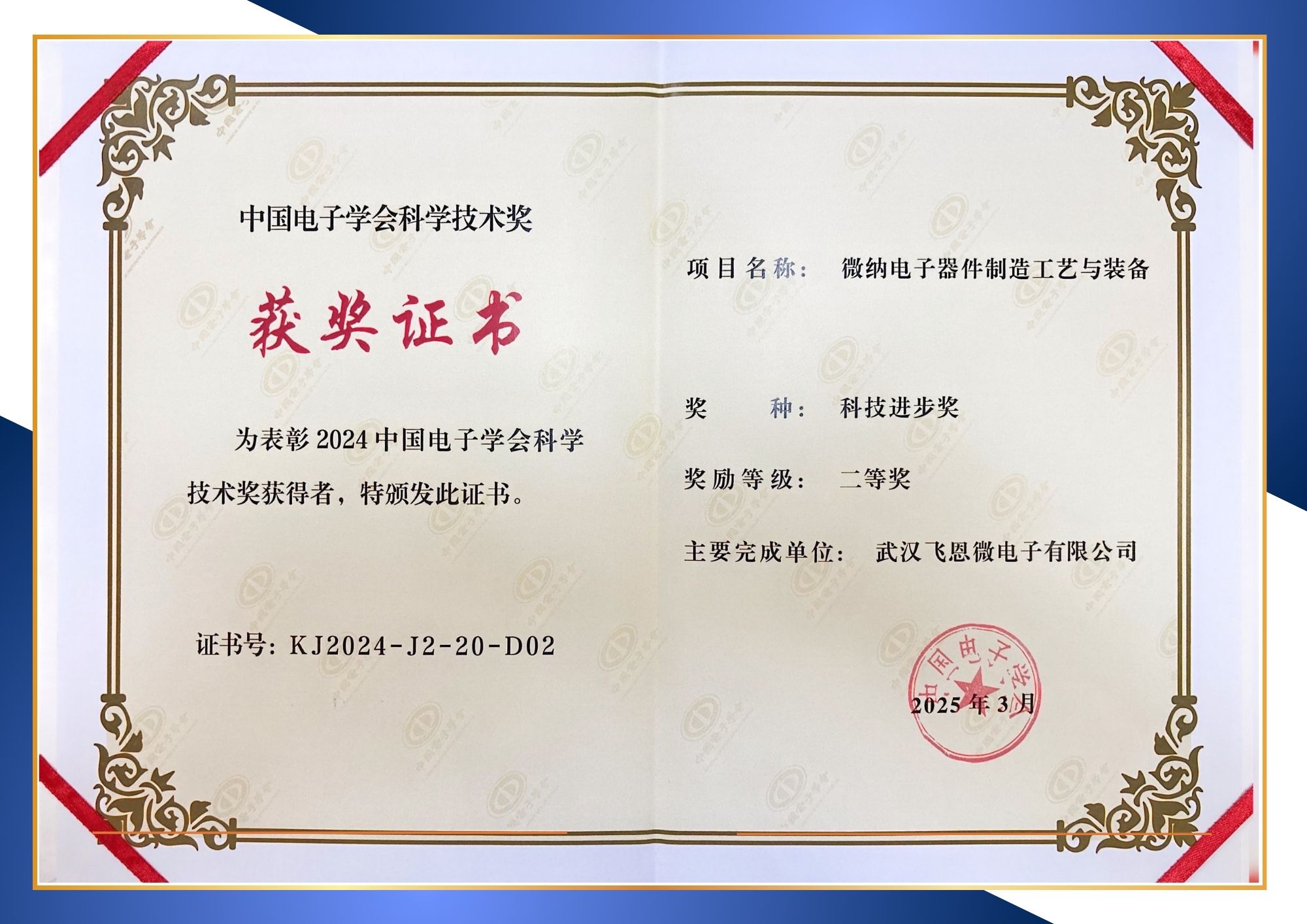 近日,中国电子学会正式公布2024中国电子学会科学技术奖名单,由武汉飞恩微电子与武汉大学联合申报的“微纳电子器件制造工艺与装备”,荣膺科技进步二等奖。